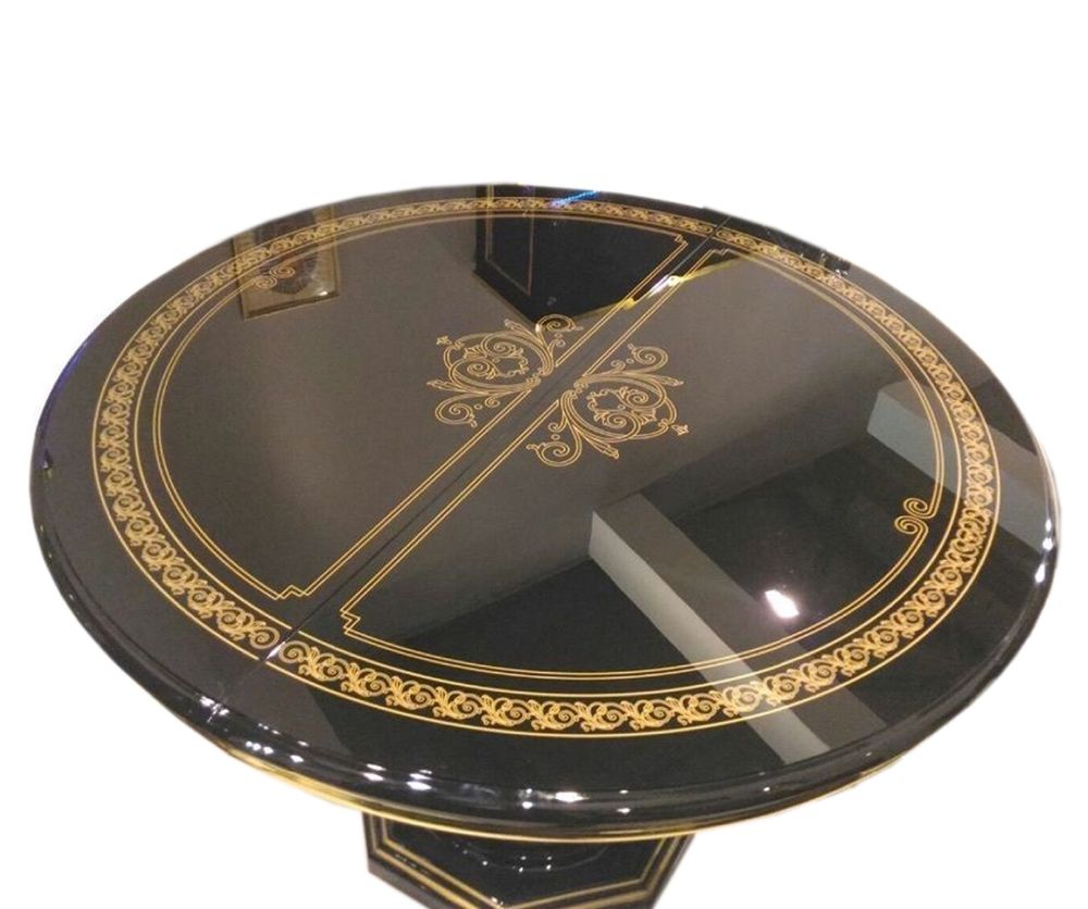 Betty Italian Round Extension Dining Table with tops in MDF wood and legs in polyurethane foam. The thick sides and tops painted by polyester in high glossy blackfinish with serigraphy in gold color.