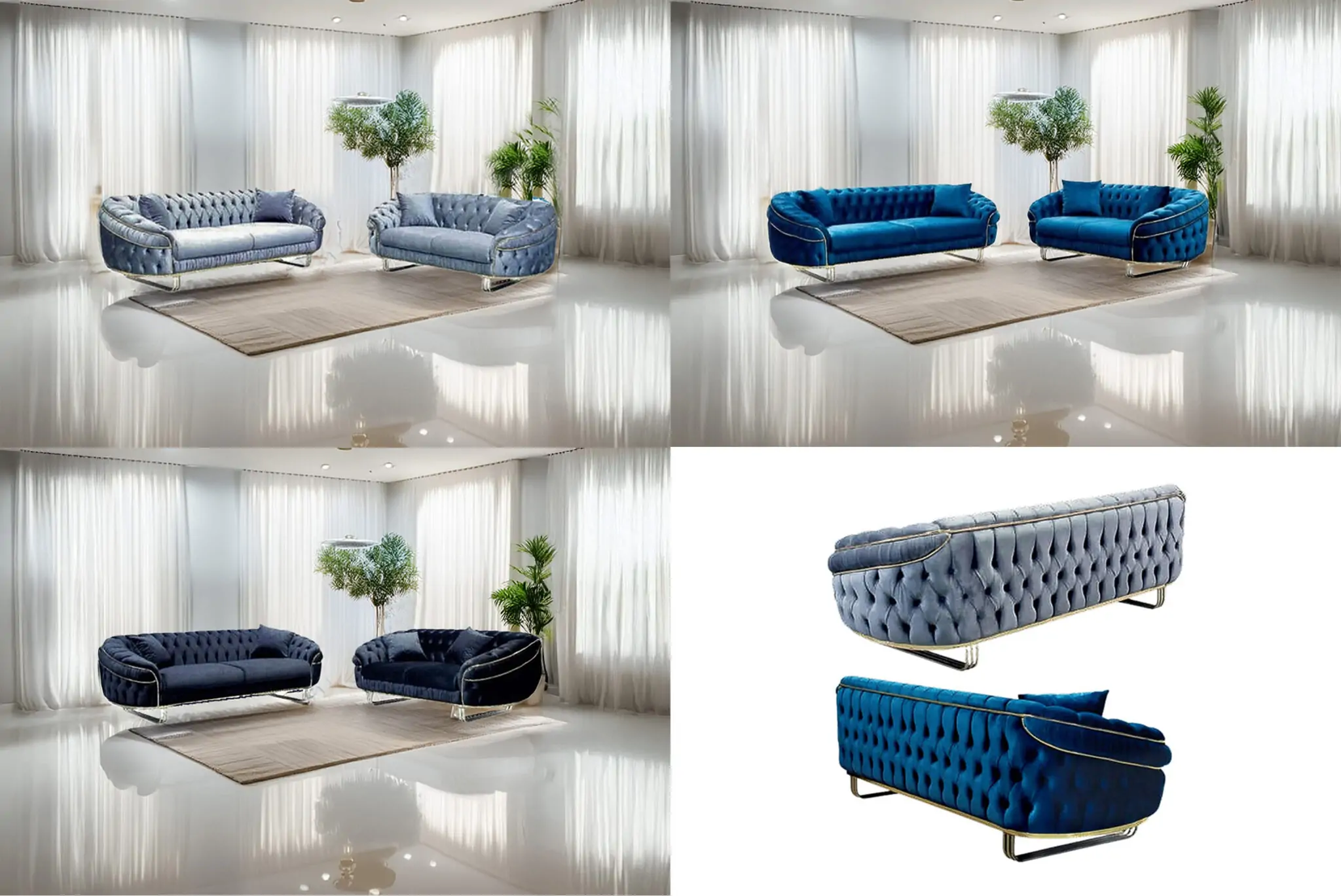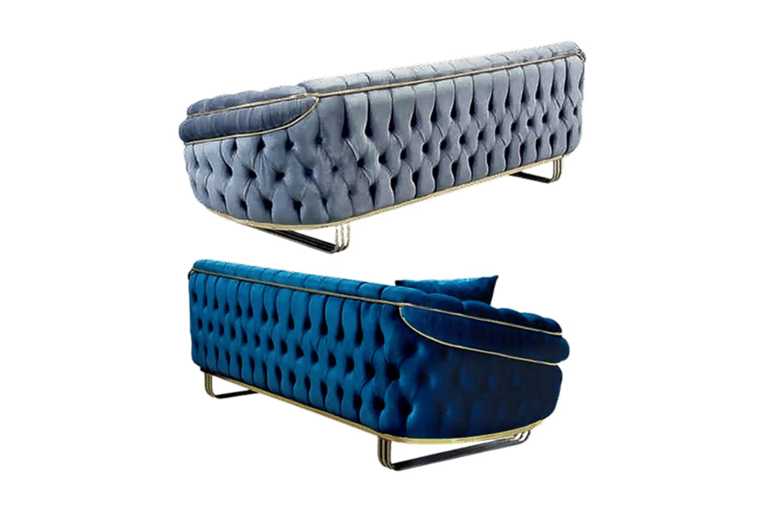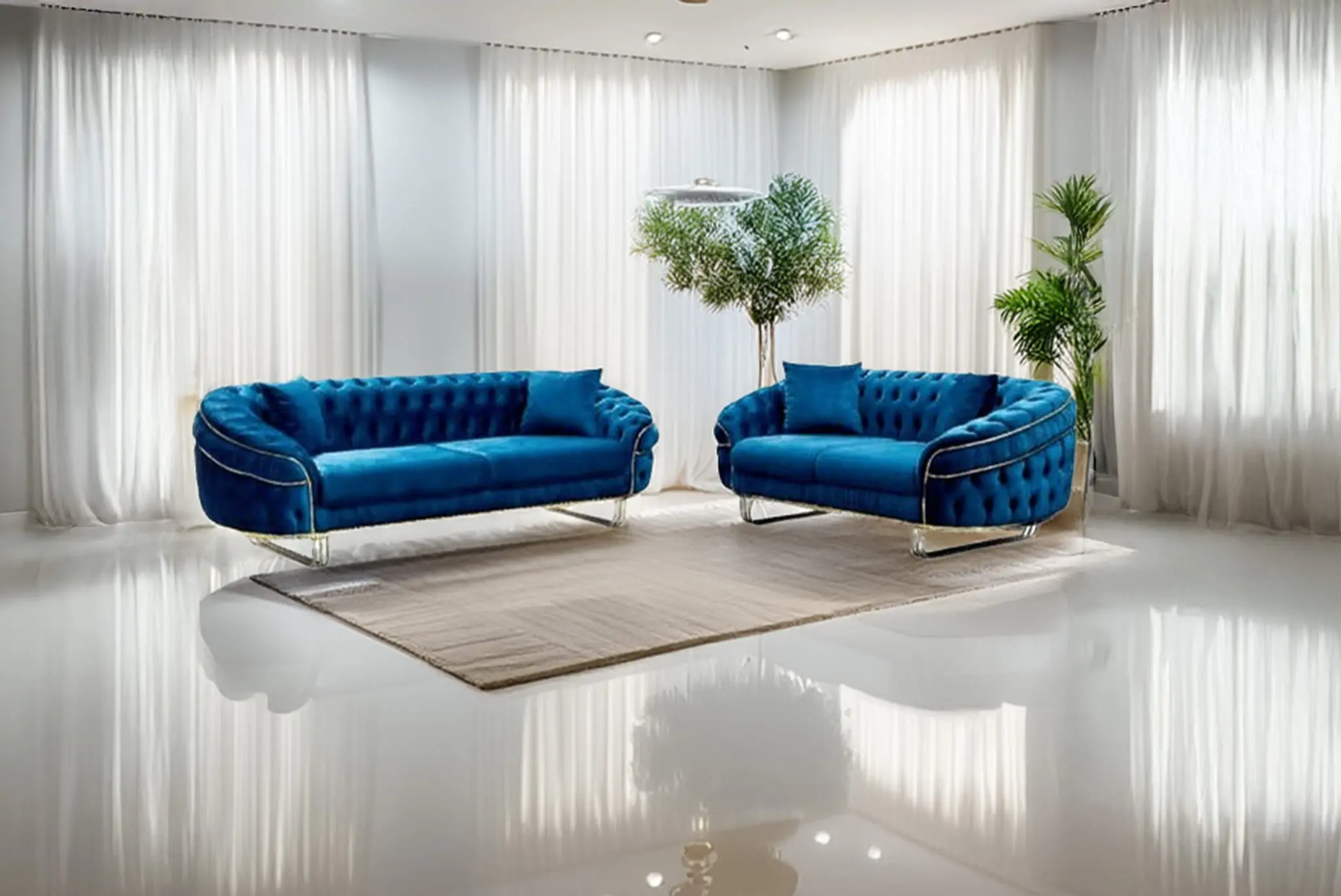The Camdon set is available in three striking colors — black, silver, and blue — allowing you to choose the perfect shade to match your style. Deep button tufting, curved arms, and soft cushioning create a rich, inviting look while providing exceptional comfort.