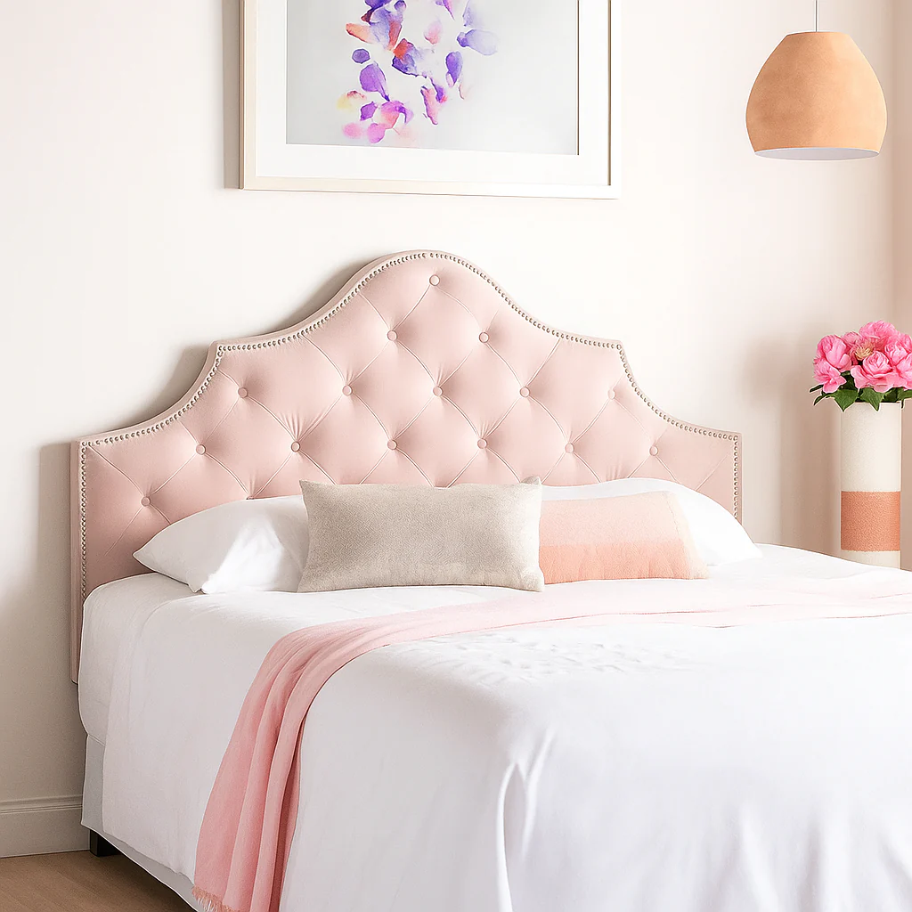 Expertly crafted with deep, hand-finished diamond tufting across its surface, every button and fold adds intricate texture, depth, and a sense of meticulous attention to detail. The design is further enhanced by delicate studded detailing tracing the outer edge, adding a subtle shimmer and tailored finish that elevates its classic appeal. Upholstered in a soft blush pink fabric, it offers a smooth, plush surface that is as comfortable to lean against as it is beautiful to look at, bringing warmth, soft colour, and a gentle atmosphere to your sleep space.