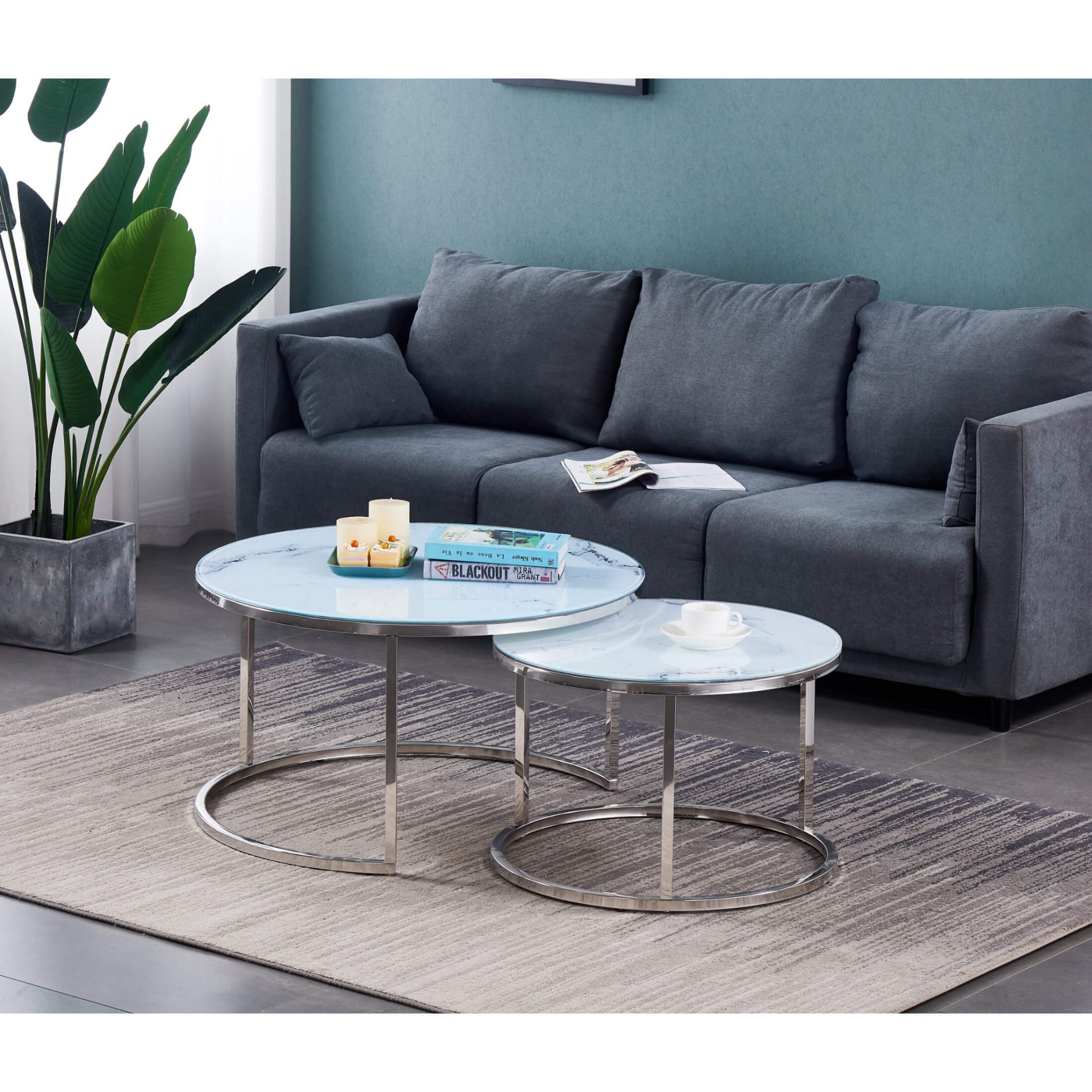 Evoque Coffee Table Set 800W Round x 410H Large, 600W Round x 360H Small Marble Effect Glass Top, Stainless Steel Base Silver