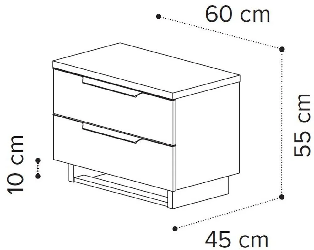 The luminous white glossy finish is coupled togheter with trapezium shaped brushed alluminium handles. Swithces for the LED diffuesd light (4000 K)located on both sides of the headboard. Beds with anti dust platform. Safe and easy to use storage space solution available. Night tables, tallboy and dressers tops 30mm thick whilst the inside of the drawer is covered with antiscratch material. All drawers run on soft closing guides.