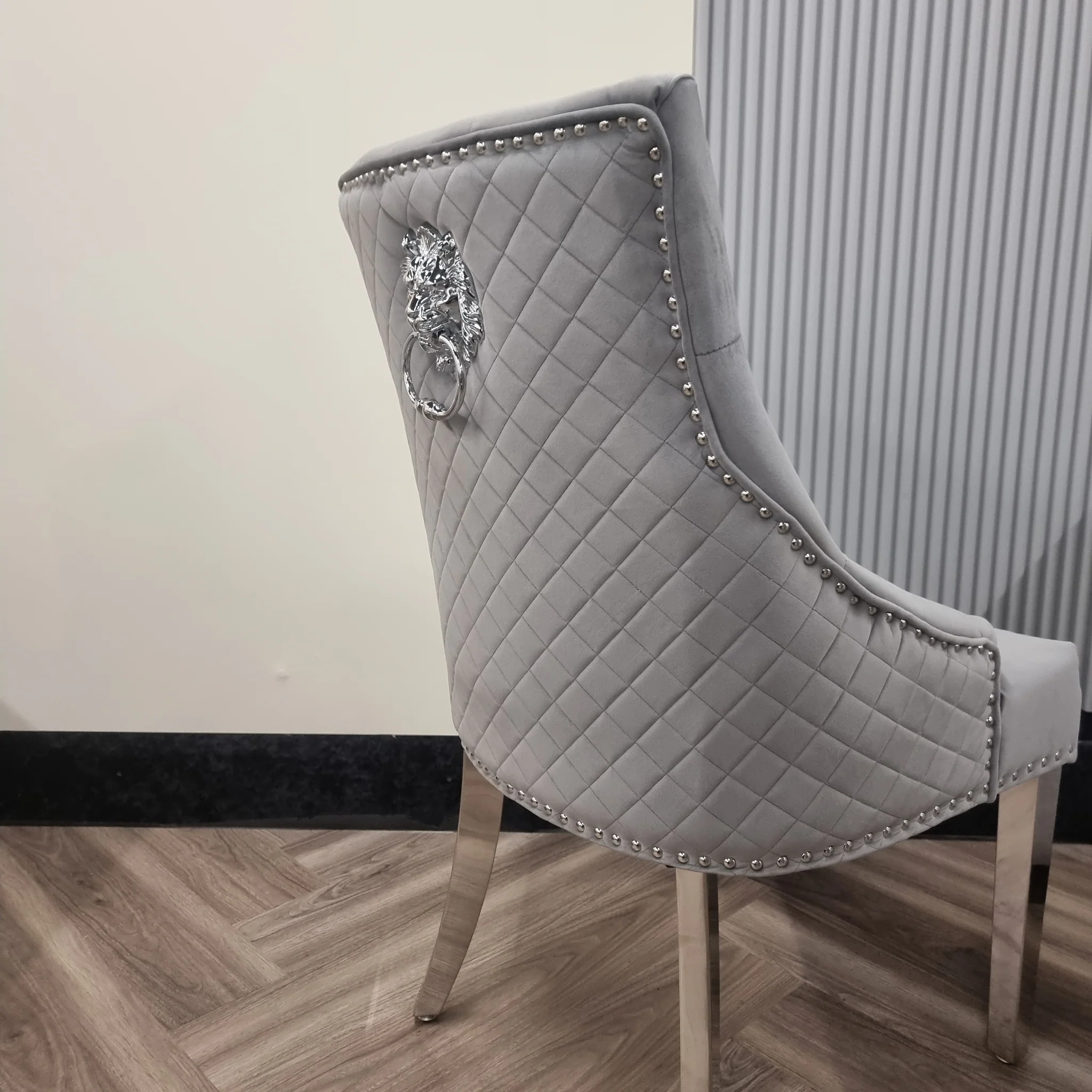 Our Bestseller, the beautiful Bentley Dining Chair is the epitome of high end furniture. Featuring stunning quilted back detail with our signature chrome lion knocker and complete with quality studded detail along the border of the chair. A beautiful piece that would compliment any of our Dining Tables. The Bentley Dining Chair is available in a velvet finish in a range of colours including dark grey, light grey and shimmer grey.