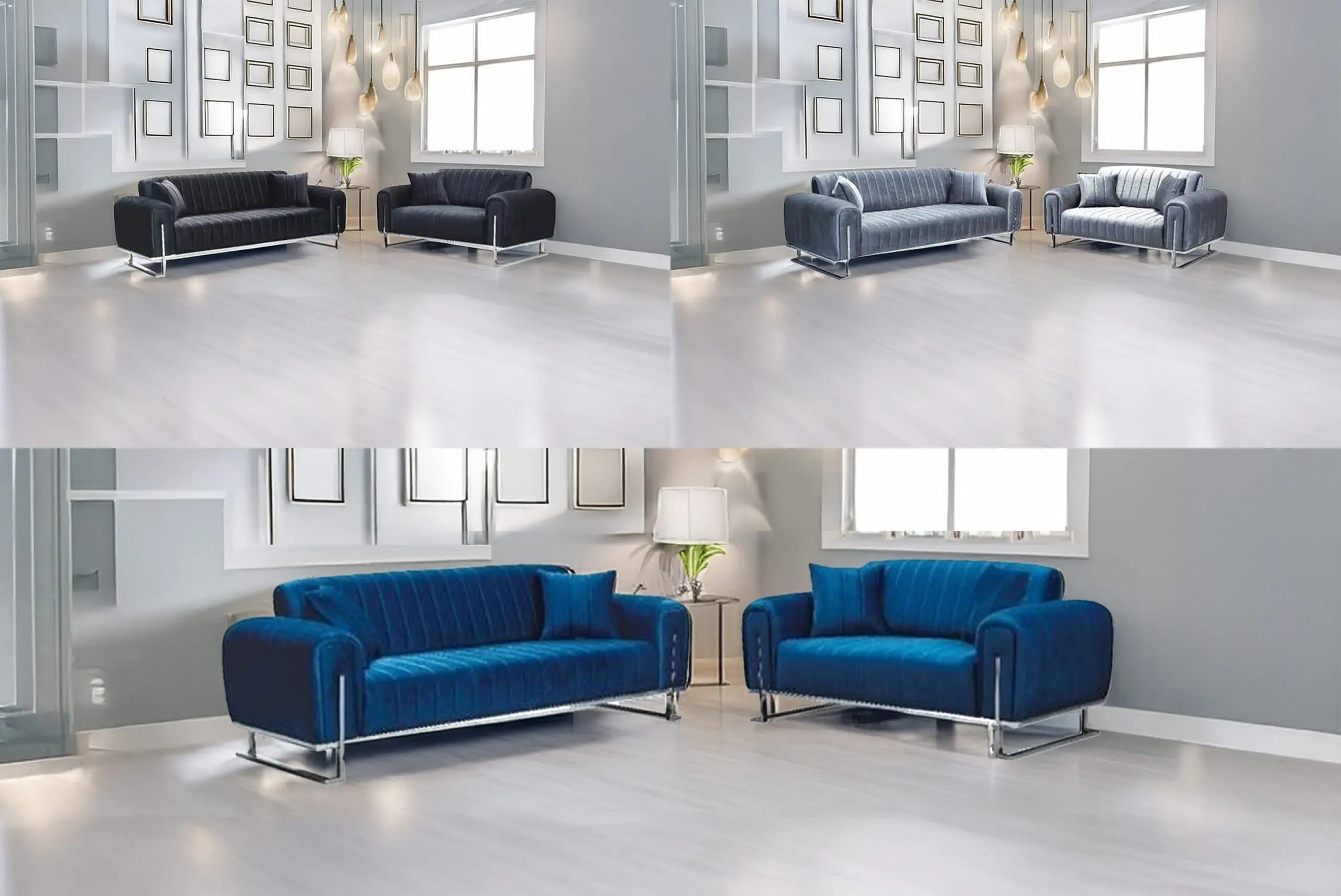 Available in black, silver, and blue, the Richmond set effortlessly complements a variety of interiors, from minimalist to glam. The plush cushions offer exceptional comfort, while the shiny chrome-finished legs provide a stylish contrast and sturdy support.