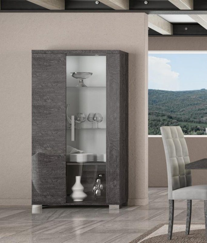 Particulars that speak about style, quality and beauty. This classy vitrine comes in a beautiful grey birch gloss finish with modern chrome handles.