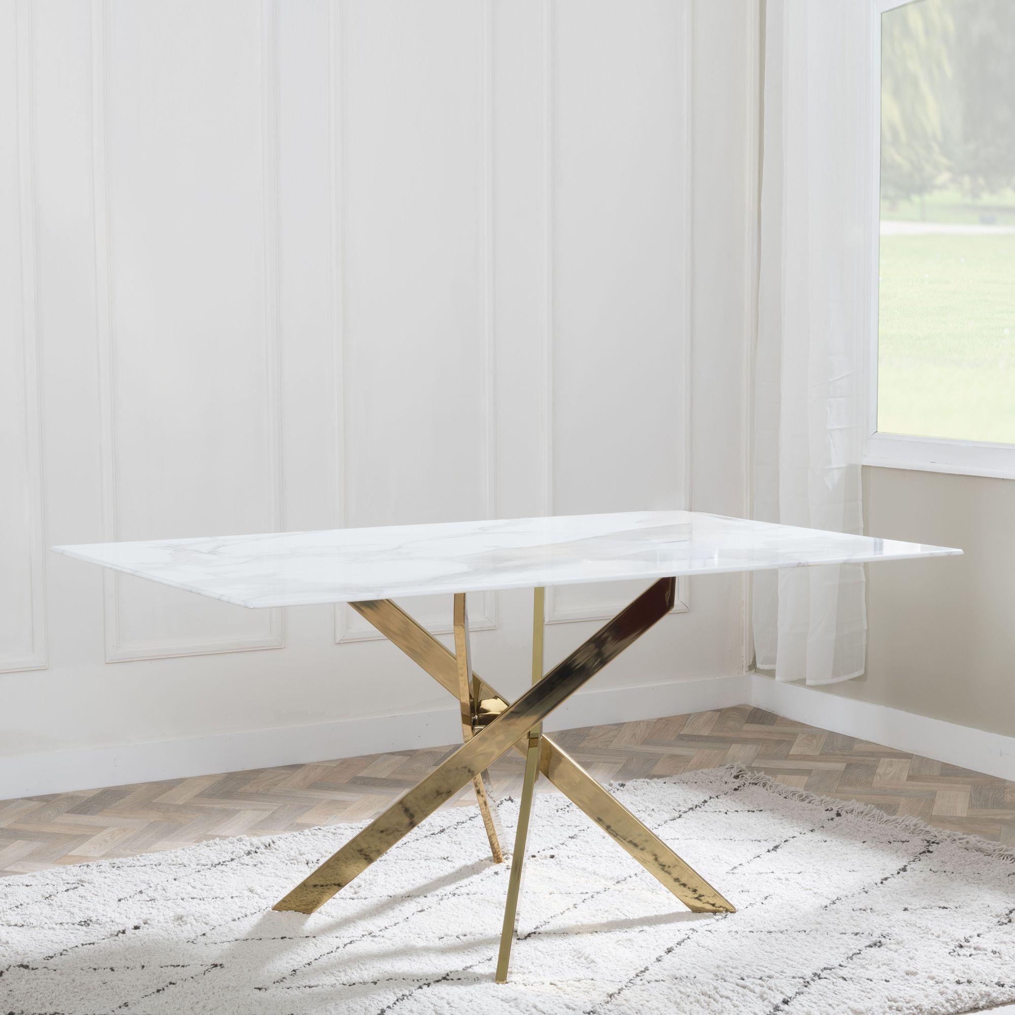 Sutton 150cm White and Gold Dining Table – Glass Top with Marble Effect: